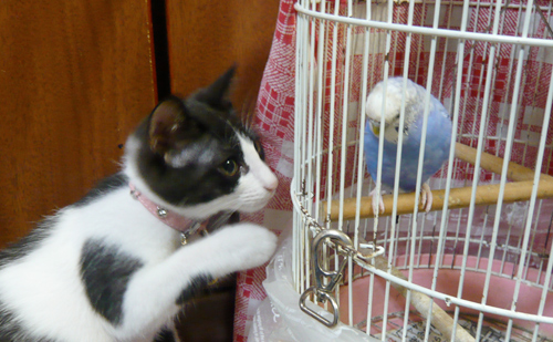 コハナ(猫)が頑張ってちょっかいだしても、クチバシにより大抵返り討ちです。